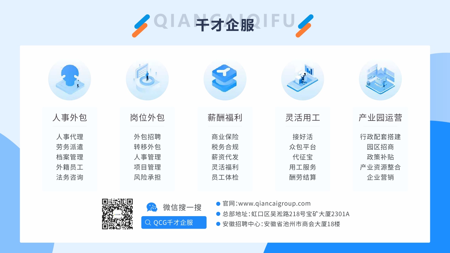 千才企业服务集团由创始人童闻义先生于2021年8月1日创立目前是人力资源行业知名企业、上海市安徽商会会员单位千才企服:一站式数字化人力资源服务天使投资方:上海灵才科技有限公司千才企服旗下:上海灵千财人力资源有限公司上海灵聘才人力资源有限公司安徽灵才人力资源有限公司上海灵才企业服务(集团)有限公司安徽千才企业服务(集团)有限公司基于全国政府产业园平台,以及领先的HR SaaS系统平台千才企服已经覆盖全国15家分支机构、服务网络遍及100多个城市、合作院校100多家安徽池州百人招聘中心、年供应能力10000人以上,目前正在为40多个行业,300多家外资、中大型国有企业和大型互联网企业等,提供一站式...